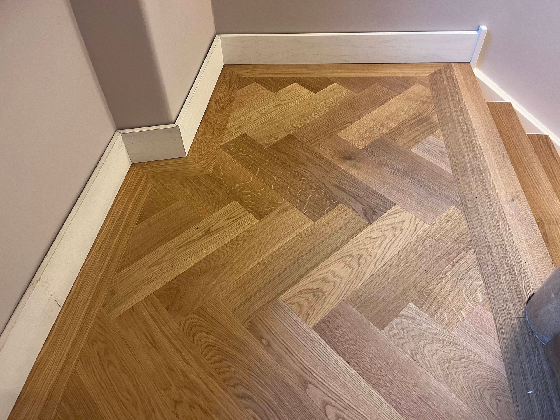 Die Podeste wurden komplett neu gestaltet und mit Massivholzdielen im Fischgrätmuster belegt. Dieses Verlegemuster gilt seit Jahrhunderten als Inbegriff stilvoller Innenarchitektur und verleiht dem Treppenhaus sofort einen repräsentativen Charakter. Die warmen Farbtöne der Eiche und die präzise Handwerksarbeit schaffen eine harmonische Verbindung zwischen Tradition und Moderne.